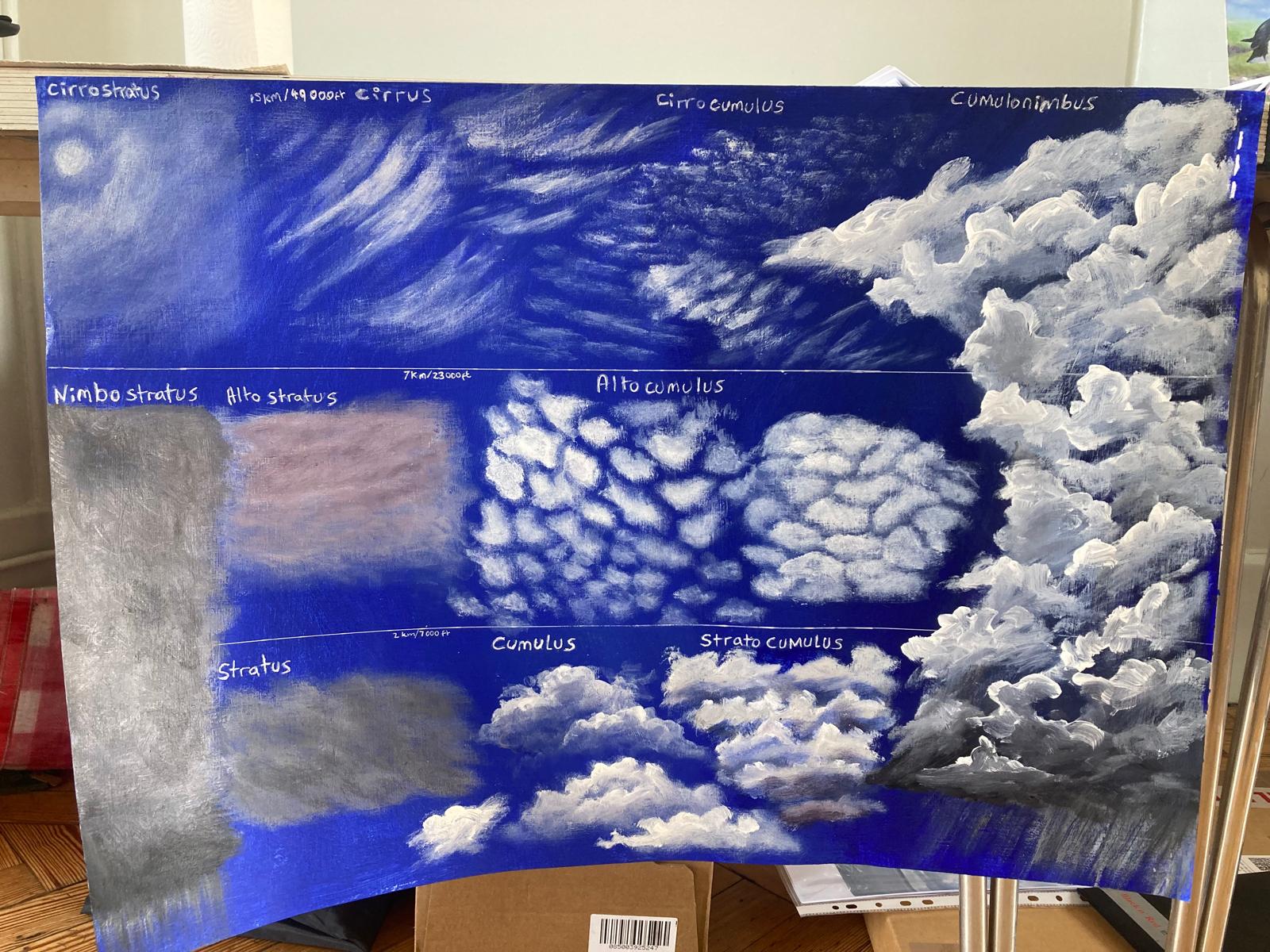 Everyone had fun with clouds at the Acrylics workshop run by Bethany Milam. She introduced us to the different cloud types and their typical characteristics. Since most of us had done sunsets before we all agreed to focus on a large storm cloud for the rest of the day. Despite the stormy subject we all chilled out!