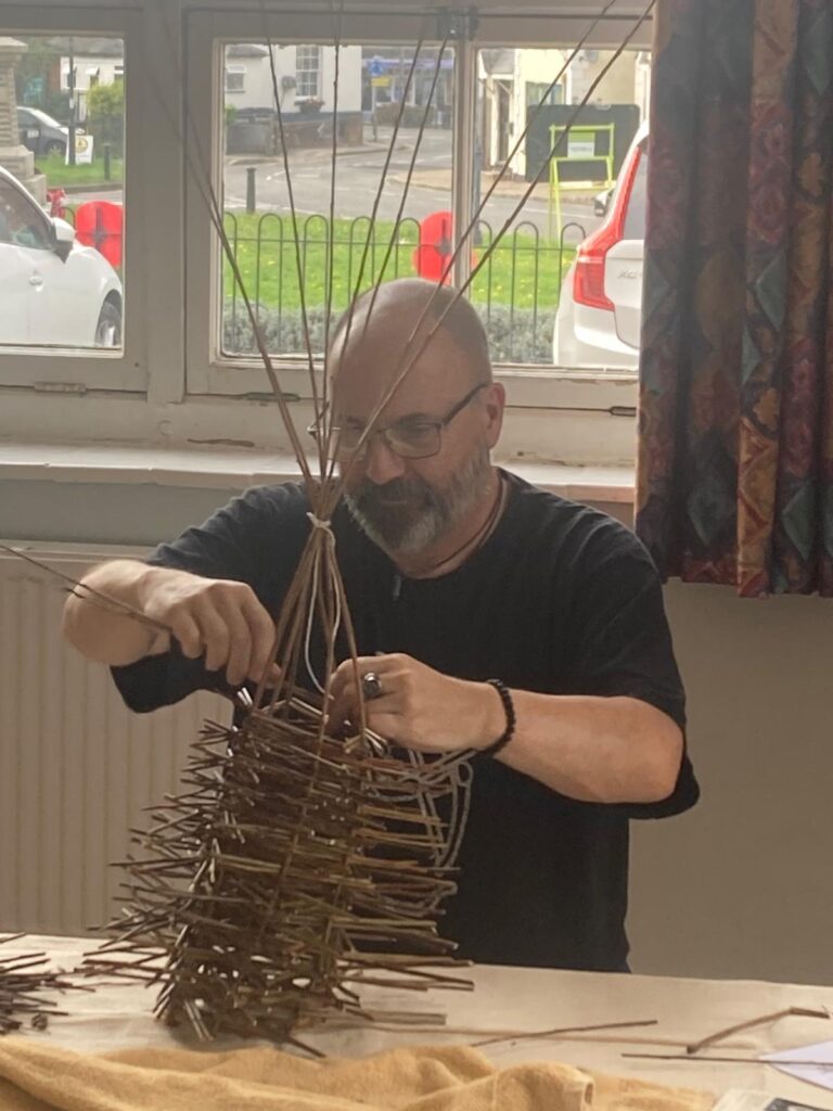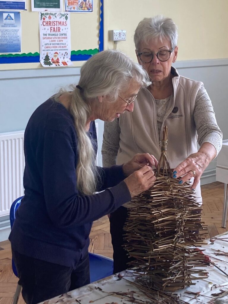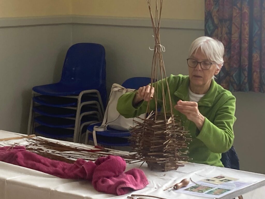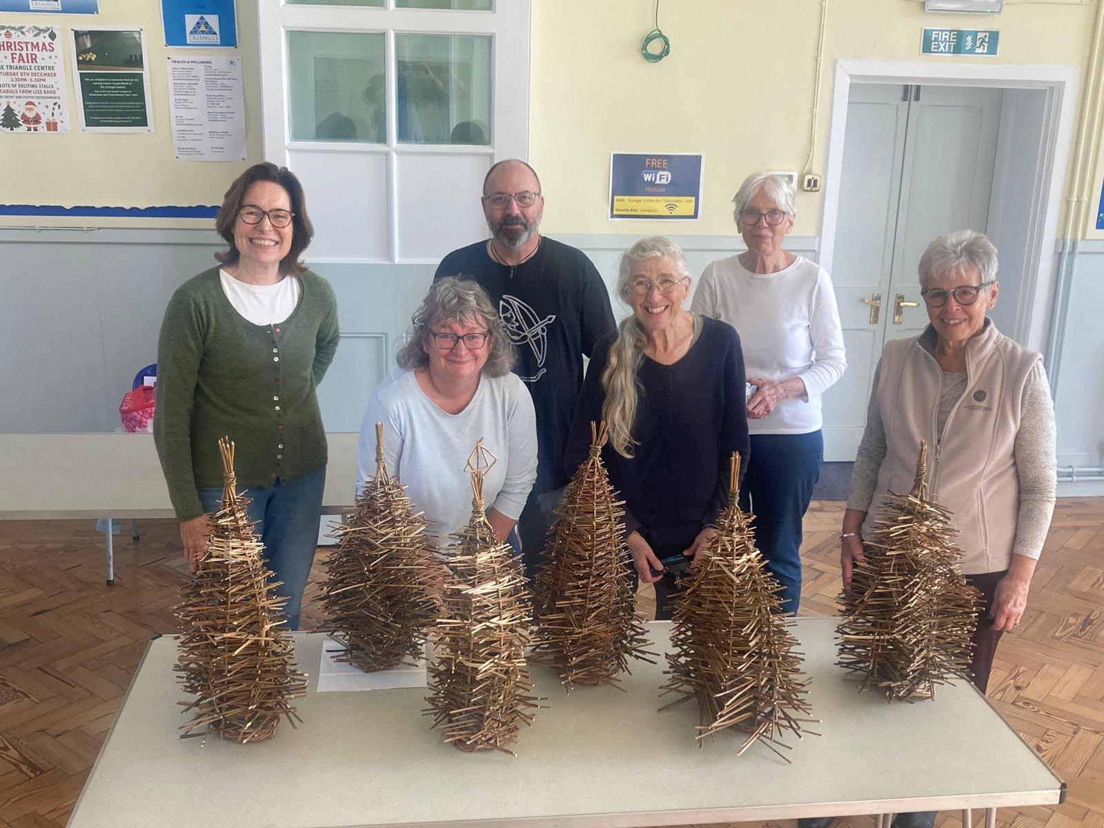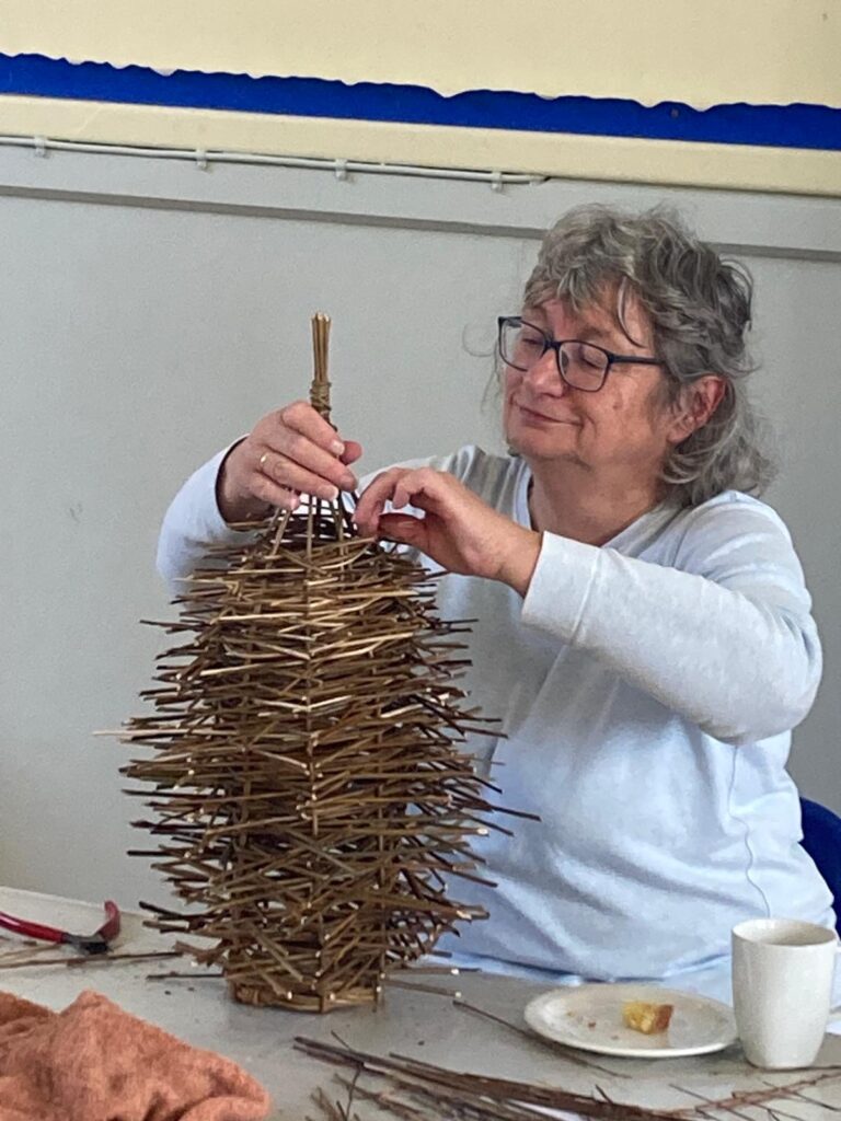 A small group took all the available places on Linda Mills “Willow Christmas Tree” workshop. Linda ran a demonstration of her basket weaving talents earlier this year. At this workshop all the participants crafted a Christmas tree from willow sticks – just in time for the festive season. You can see from the photos that the group enjoyed the event, and all produced beautiful tree.