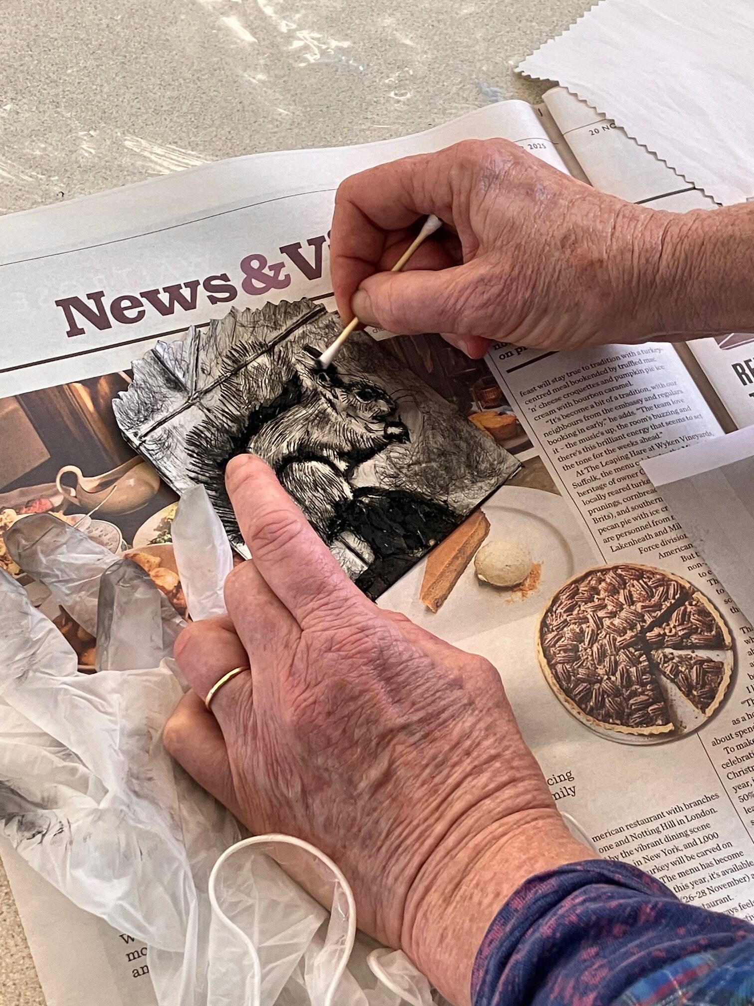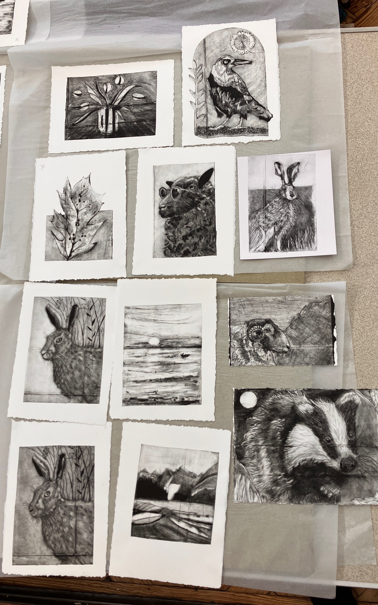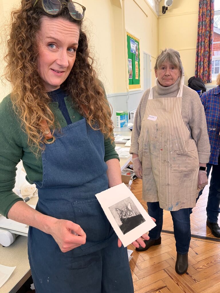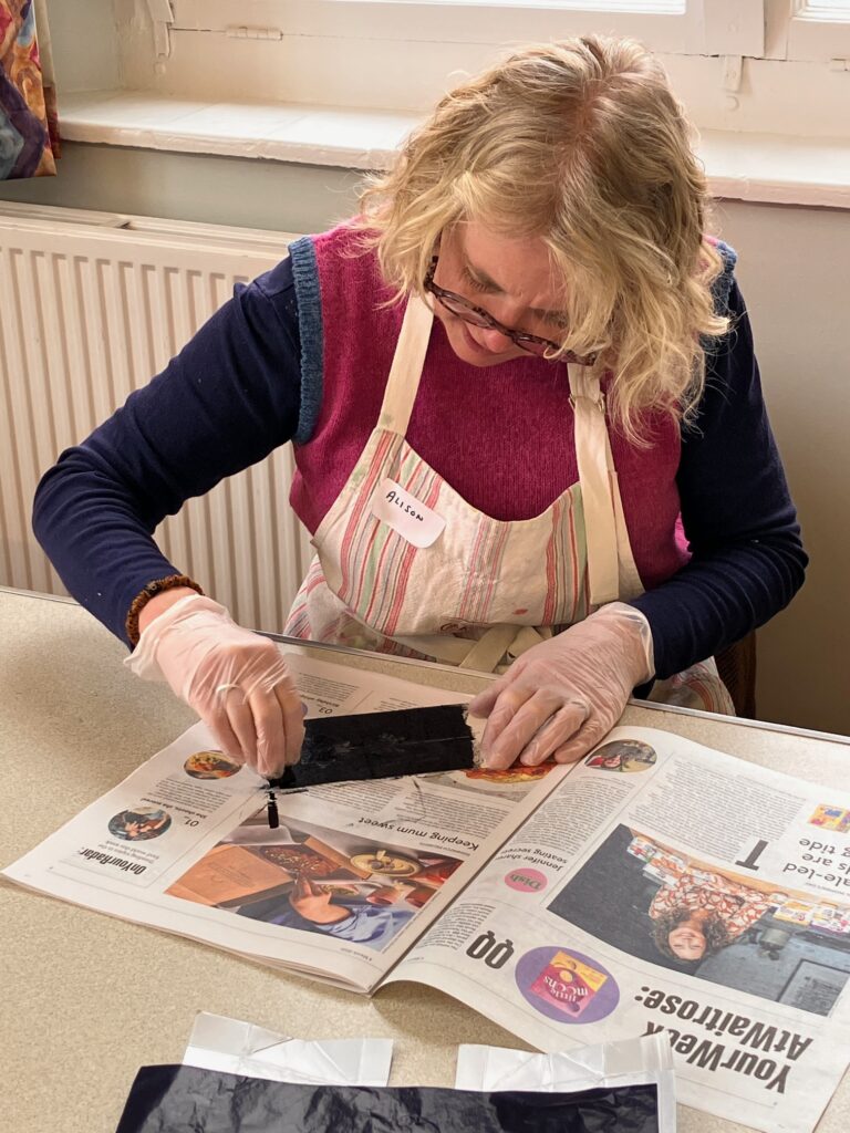 Following a very successful demonstration in February, Kate Alger returned to lead a workshop of printmaking using Tetra Paks. The cardboard drinks containers you get from the supermarket often have a foil liner and this can be scored to create a printing plate. The ink flows into the score lines and can then be transferred onto paper. The plate can be re-used a few times too. This was a sell-out workshop and looking a the output from the day, it’s easy to see why.